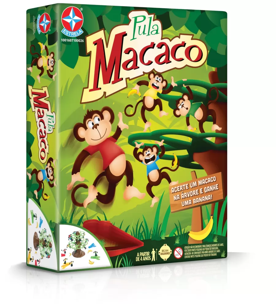 Os macaquinhos adoram ficar balançando de galho em galho. Acerte o macaco na árvore... Que ele dá banana para você! Recomendado para crianças a partir de +4 anos. De 2 a 4 jogadores.