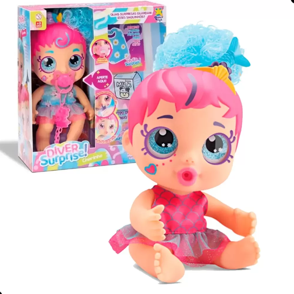 A Boneca Baby Mama e Chora vem na versão vestido, com uma base em cetim resinado e malha tule azul e rosa. Além disso, ela é interativa e permite que as crianças coloquem água na mamadeira e deem para a baby, que soltará lágrimas pelos olhos, tornando a brincadeira ainda mais realista e divertida.