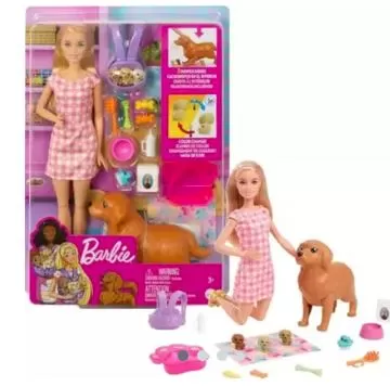 Com o conjunto Barbie cachorrinhos recém-nascidos, as crianças podem ajudar a boneca Barbie a fazer o parto de três adoráveis filhotes de cachorro quando pressionam as costas da mamãe. Depois de dar as boas-vindas aos filhotes, as crianças podem encher a banheira com água gelada, depois mergulhar a toalha e passar sobre os cachorrinhos para revelar uma marca especial de nascimento em cada um. Os joelhos flexíveis da boneca Barbie ajudam-no a acolher os seus novos pets e, com um suporte para cachorros adorável com espaço para os três cachorrinhos, ela pode cuidar deles em movimento!