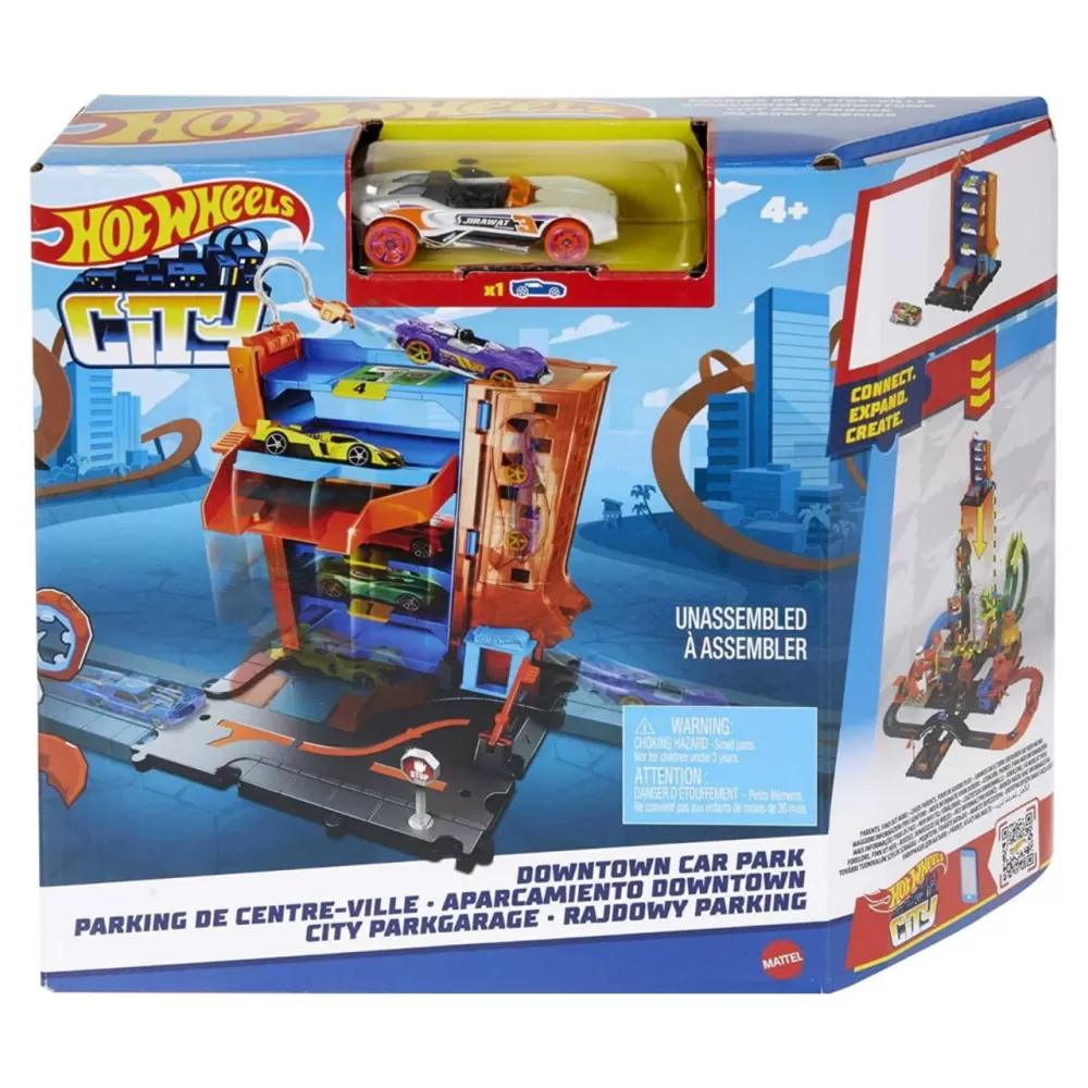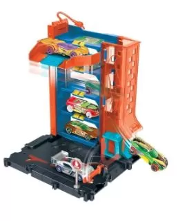 Toda cidade precisa de um estacionamento, mas para ser tão incrível quanto o estacionamento da Hot Wheels™ City, ele precisa de recursos sensacionais, como uma rampa de saída transparente, elevador para carros e portões móveis! Este conjunto de estacionamento tem quatro andares, e cada andar se conecta à rampa de saída translúcida que lança os carrinhos para novas aventuras. Ele se conecta a outros conjuntos Hot Wheels® por meio de múltiplos pontos de conexão (cada conjunto vendido separadamente) e vem com um carrinho Hot Wheels®